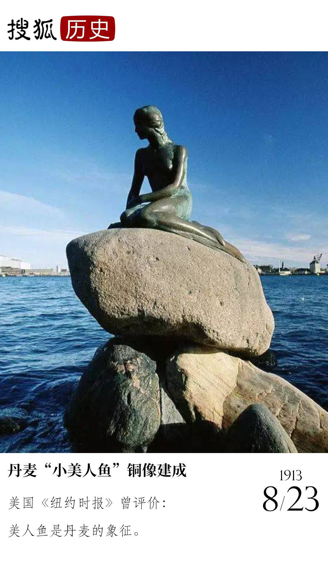 1913年8月23日,丹麦世界闻名的“小美人鱼”铜像建成。这座铜像是由丹麦著名雕刻家爱德华•艾瑞克森根据安徒生童话《海的女儿》铸塑的,由青铜塑像和花岗岩底座两部分组成,高约1.5米,重175公斤。