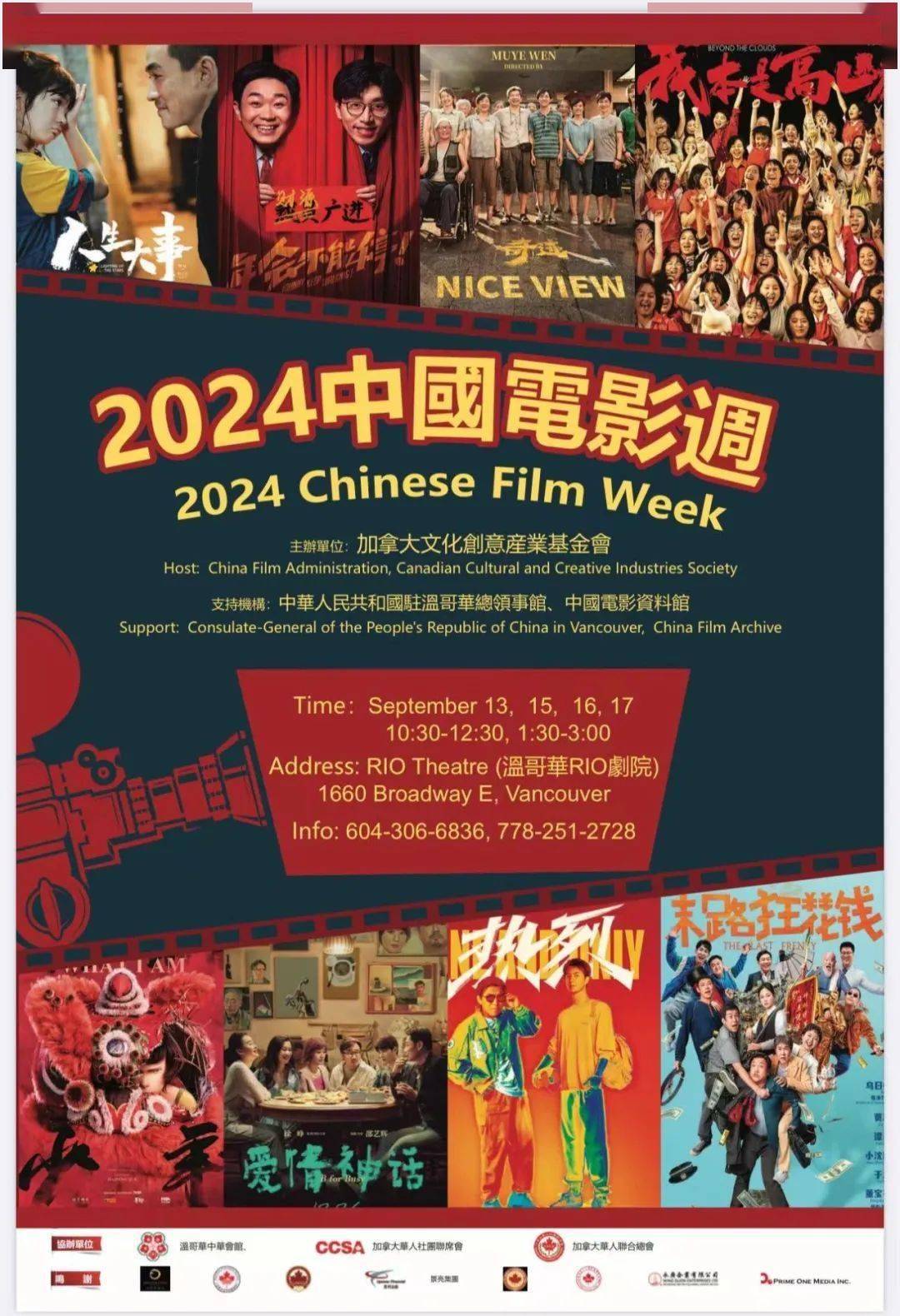 此次中国电影周由加拿大文化创意产业基金会主办,获中国驻温哥华总领馆、中国电影资料馆支持。温哥华中华会馆、加拿大华人社团联席会、加拿大华人联合总会等大温哥华地区多个华人社团参与协办。