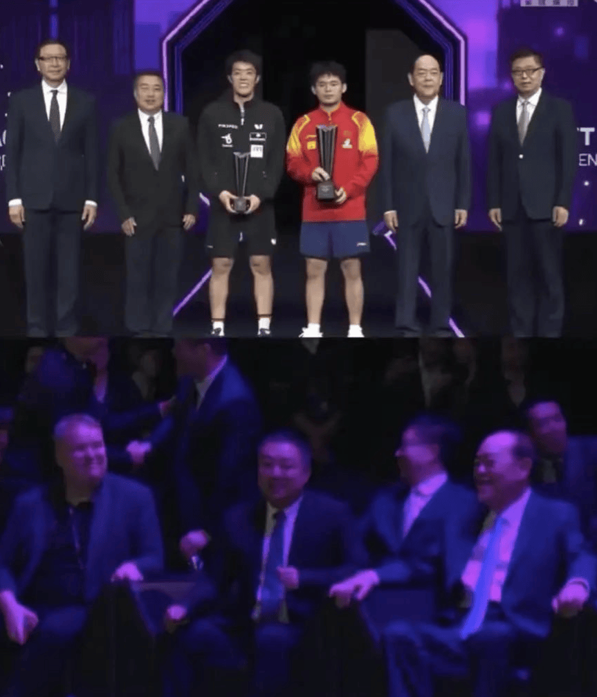 赛后的发布会,林诗栋和孙颖莎作为男女单的冠军参加,他们俩坐到了一块,可实际上之前颁奖的时候,却并不是这样的场面。给孙颖莎颁奖的是WTT世界乒乓球职业大联盟的高层,而给林诗栋颁奖却是刘国梁本人,他决定亲自出马,给林诗栋颁发男单冠军奖杯,这个待遇可以说是绝无仅有的。