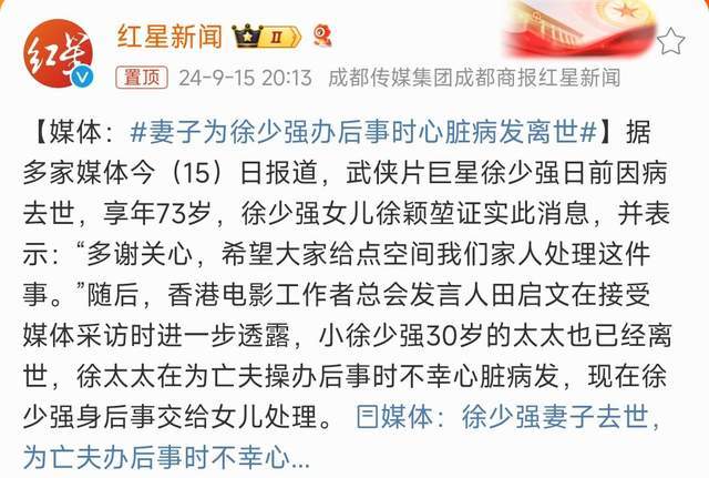 继郑佩佩之后,又一熟悉的面孔消失在观众的生活当中,9月15日,曝出徐少强因食道癌去世的消息引发热议,随后,媒体从电影人田启文处获悉,与徐少强年龄相差约30岁的其第三任太太在为亡夫操办后事时因突发疾病逝世。