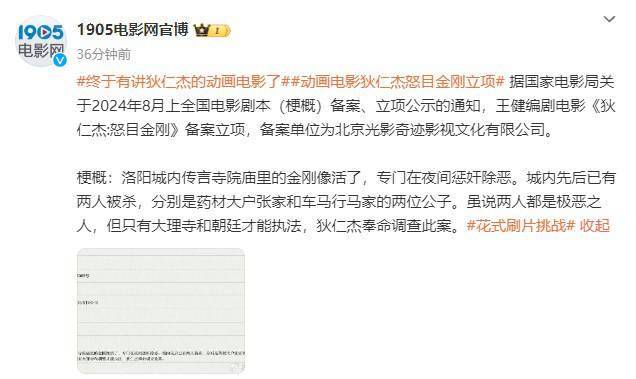 1905电影网讯9月14日,据国家电影局关于2024年8月上全国电影剧本(梗概)备案、立项公示的通知,由王健编剧的动画电影《狄仁杰:怒目金刚》备案立项,备案单位为北京光影奇迹影视文化有限公司。
