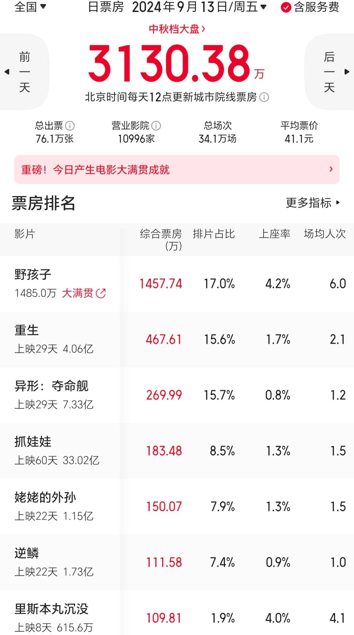 因冷清的市场缺少竞争,《野孩子》次日预排片大涨至32.3%,预售票房过了500万元,占了大盘总预售票房的66%。