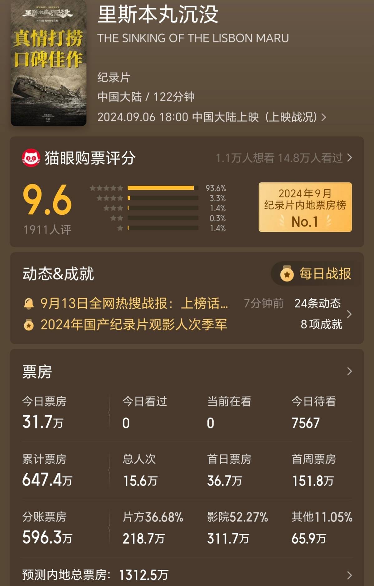 在影迷聚集的豆瓣获得9.2分,在大众购票平台猫眼获得9.6分的高分纪录片《里斯本丸沉没》靠好口碑连日逆袭,在上映第八天单日票房突破100万元,达到新高。上座率仅次于《野孩子》,排第二。猫眼专业版将这部片的最终预测票房提高到了1300多万元。