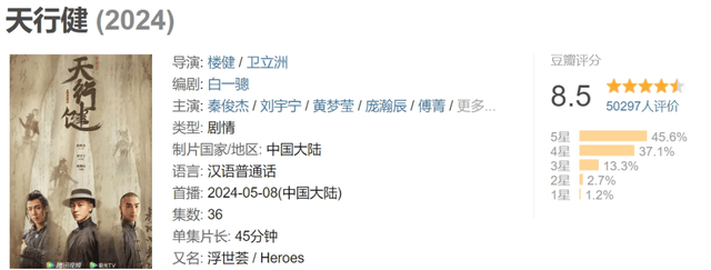 在2024年的暑期档,《凡人歌》开播之前,秦俊杰还有一部口碑8.5分的奇作《天行健》率先登场。撞档同期大IP、大制作,这部作品最初并没被外界看好,但是从故事设定到演员的表现,悉数甩开了当下古装剧的模式,意外出圈。
