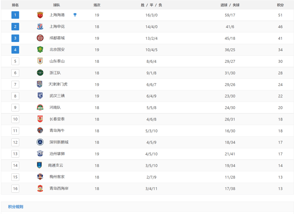 上海海港主场大胜北京国安,取得各项赛事13连胜,积51分继续领跑中超积分榜。上海海港本赛季的进攻非常凶猛,总进球数已达到59球,领先第二多的成都蓉城超过10球。北京国安遭遇2连败,排名没什么变化,继续排在第四名但与前三的差距拉大。
