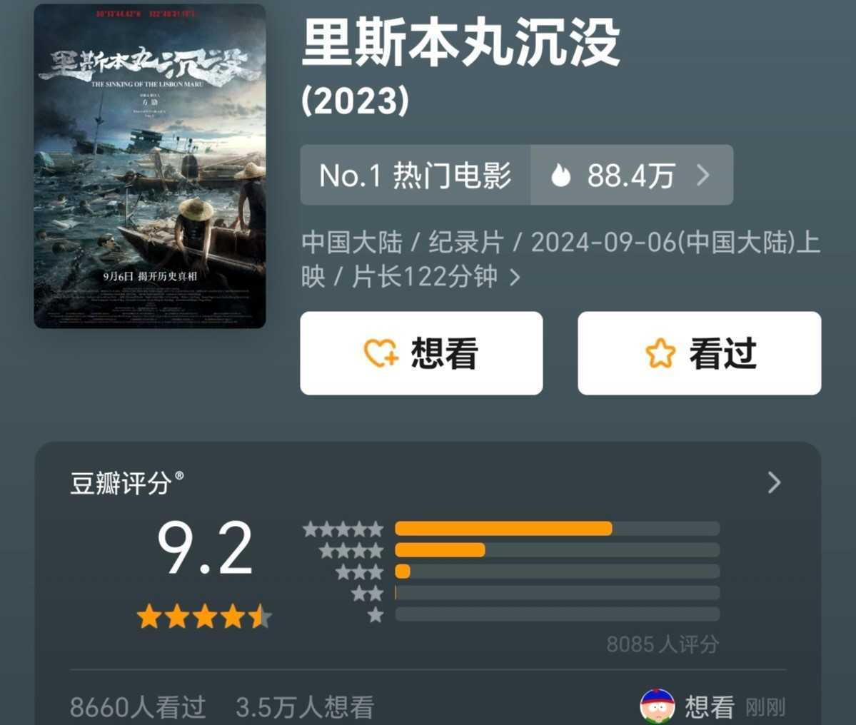 搜狐娱乐讯 (哈麦/文)正上映的纪录电影《里斯本丸沉没》在影迷聚集的豆瓣开出了9.2的高分,是今年国产片评分第一。在大众购票平台猫眼,该片评分9.6分,超过了《抓娃娃》《飞驰人生2》《第二十条》等很多热门商业片,跟《年会不能停》并列第一。