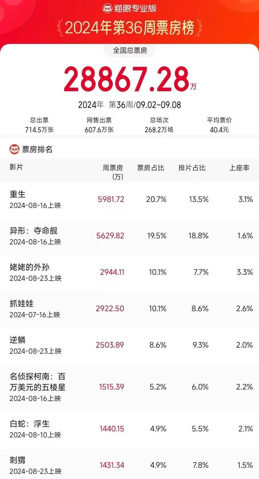 上映第四周的两部老片,继上周后再次占据周票房榜前二:张家辉、阮经天主演的犯罪电影《重生》一周报收5981万夺得周冠,目前累计票房已破3.8亿,最终票房突破4亿不在话下;好莱坞经典科幻惊悚IP续作《异形:夺命舰》一周报收5629万屈居亚军,累计票房已破7.2亿,中国内地仍然是本片的最大市场。