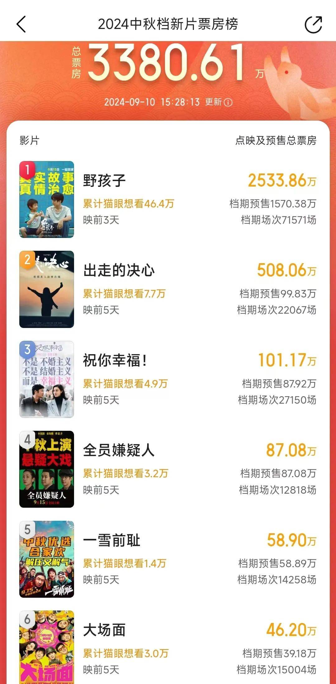 王俊凯领衔主演的流浪儿童题材新片《野孩子》,目前暂时领跑中秋档预售票房榜;肖央、宋佳、倪大红、吴越主演的《祝你幸福!》聚焦的是家庭和生育主题;改编自“50岁阿姨自驾游”真实经历的《出走的决心》,则是主打“为自己而活”的女性主义作品。