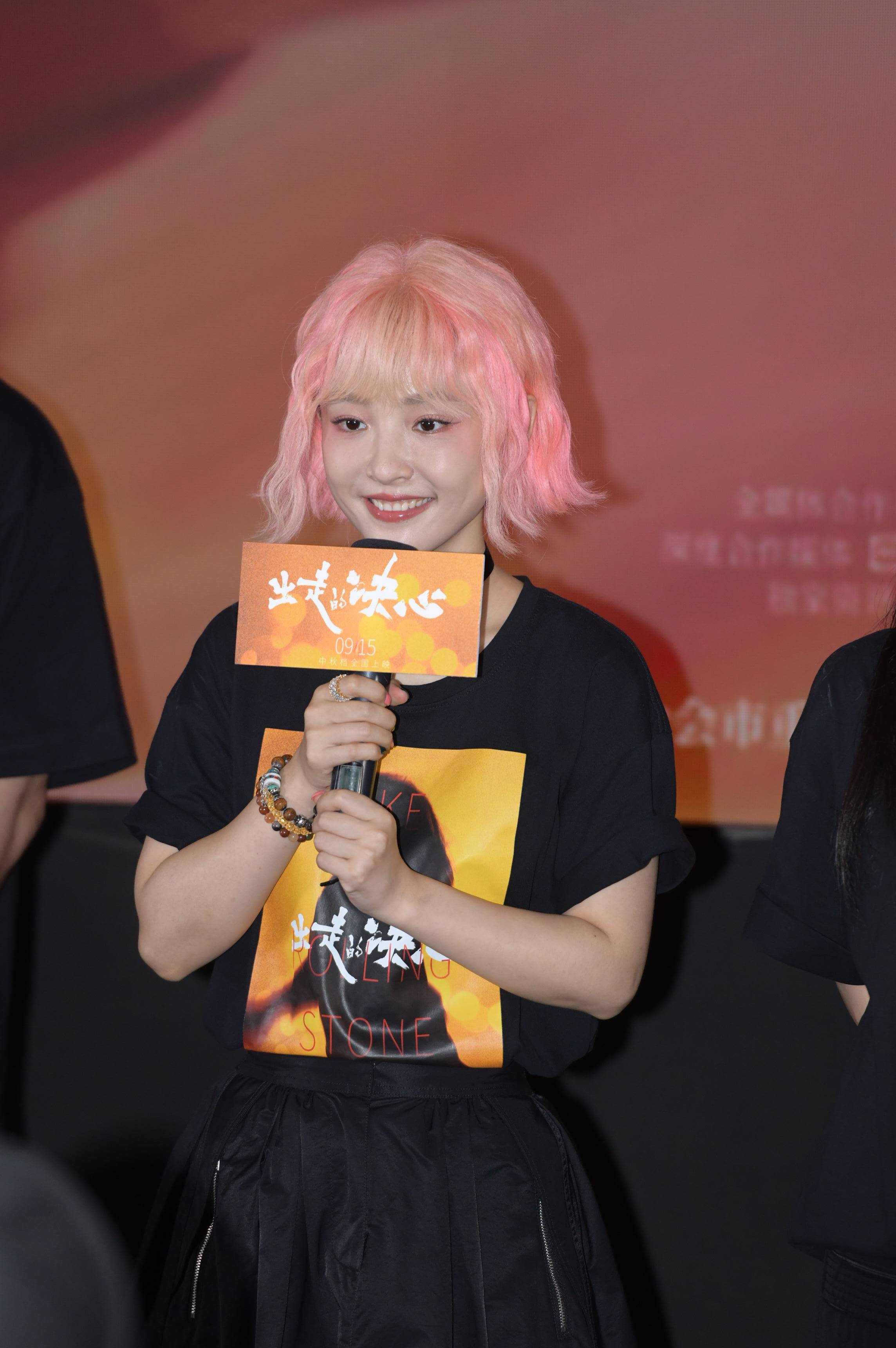 吴倩则回应道自己和角色的经历比较相似,“我跟晓雪挺像的,家庭的中坚力量,上有老下有小的,所以在跟导演聊天的过程当中,导演觉得我跟晓雪的家庭带给她的一些很多东西很类似。我觉得我有这样天然的优势,这是我的家庭赋予给我来演这个戏的天然优势。”吴倩今天染了粉红色的头发出席,她表示自己带着新造型来看这部电影,希望大家不一定要出走,但能有勇气穿上红裙子。