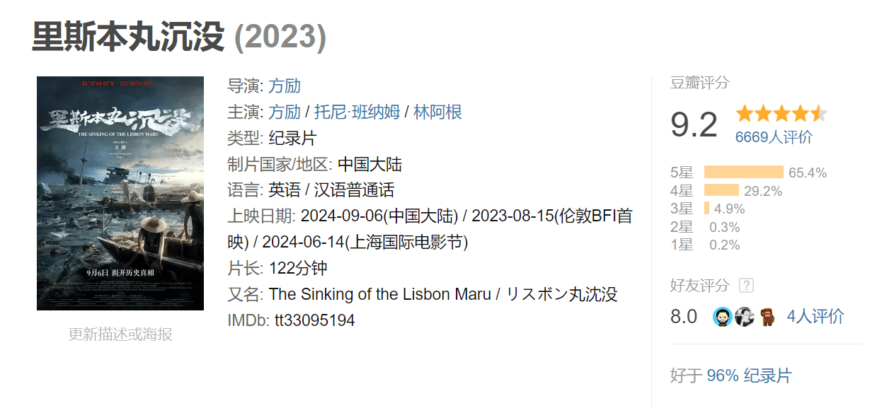 方励导演耗时8年制作完成的《里斯本丸沉没》上映的第四天,豆瓣开出9.2的高分。