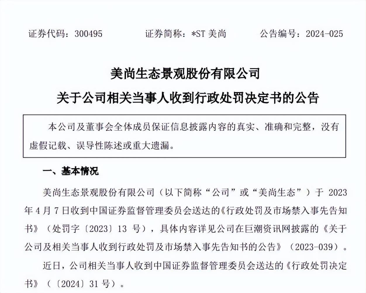 由于公司实际控制人王迎燕指使美尚生态从事信息披露违法违规、欺诈发行行为,违法情节特别严重,证监会决定对王迎燕采取证券市场终身禁入措施。此前,她已数次被深交所给予公开谴责、通报批评的处分。