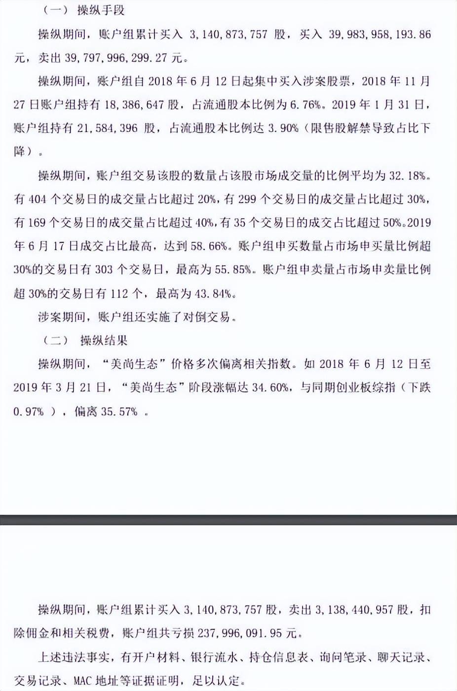 公告显示,2018年6月12日至2020年7月3日,王迎燕、季云实际控制“吴某”等113个证券账户(以下简称“账户组”),连续交易“美尚生态”,对“美尚生态”进行操纵。操纵期间,账户组累计买入31.4亿股,买入399.84亿元;卖出31.38亿股,卖出397.98亿元,累计交易额近800亿元。扣除佣金和相关税费,账户组共亏损约2.38亿元。