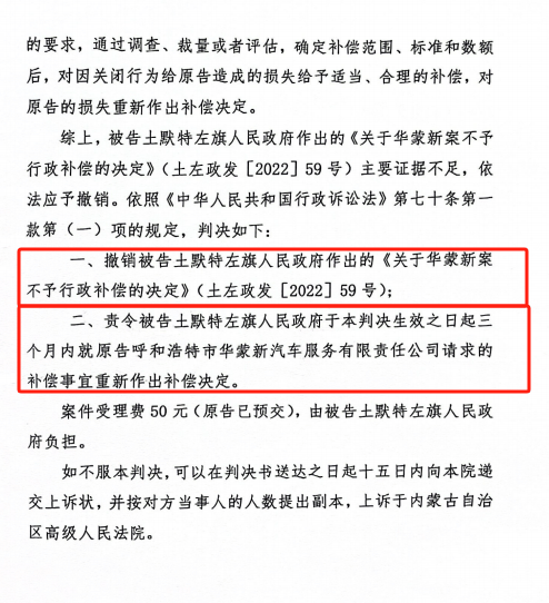 今年3月26日,呼和浩特市中级人民法院已作出判决,土左旗政府作出的《关于华蒙新案不予行政补偿的决定》主要证据不足,依法应予撤销。并责令被告土默特左旗人民政府于本判决生效之日起三个月内就原告呼和浩特市华蒙新汽车服务有限责任公司请求的补偿事宜重新作出补偿决定。
