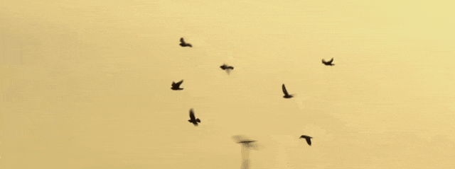 在阳光炙烤下泛黄的天空中,一群鸽子紧贴着教堂的穹顶飞行。
