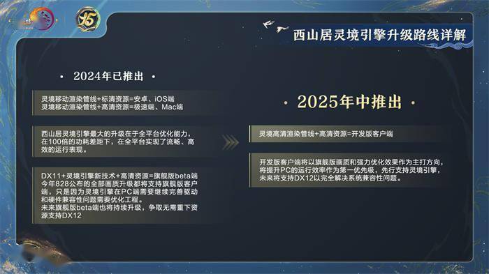 而在2025年中,《剑网3》将推出剑网3旗舰端开发版,新的开发版将以旗舰版画质和强力优化效果作为主打方向,将提升PC的运行效率作为第一优先级,先行支持灵境引擎,未来将支持DX12以完全解决系统兼容性问题。
