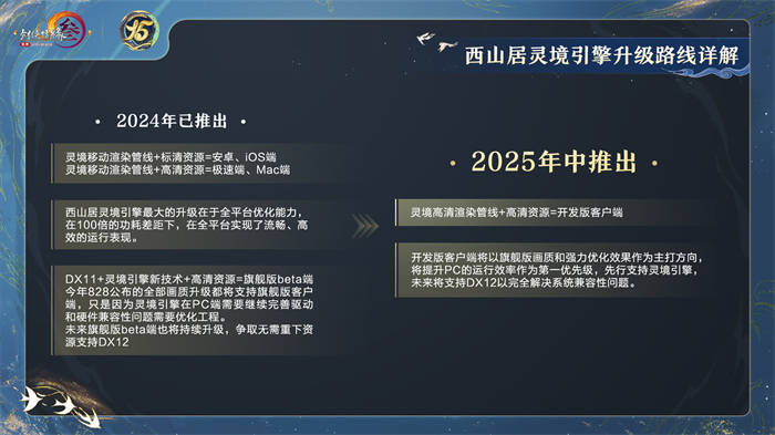 而在2025年中,《剑网3》将推出剑网3旗舰端开发版,新的开发版将以旗舰版画质和强力优化效果作为主打方向,将提升PC的运行效率作为第一优先级,先行支持灵境引擎,未来将支持DX12以完全解决系统兼容性问题。