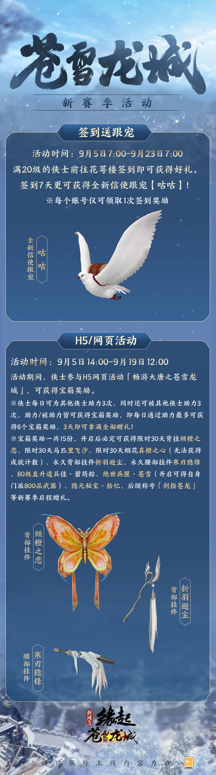 歌起征思芦管怨,透穿玄甲朔风寒。《剑网3缘起》 新赛季“苍雪龙城”震撼开启,全新双心法门派苍云来袭!层云乱,雪茫茫,盟书际,关山歃血,奢华包身披风礼盒「歃血关山」携特效外装「霹雳弦声」一同亮相!全新秘境风雪稻香村、雁门关之役还待诸君一战!横戈荡决玩法升级、买断制“行商令”上线,一次买断,终身受益,还有多重精美好礼免费领!七日签到兑换萌趣信使功能跟宠、参与畅游大唐H5小活动更有永久挂件、80级直升道具、800品本门派武器,永久称号“剑指苍龙”等豪礼可得!