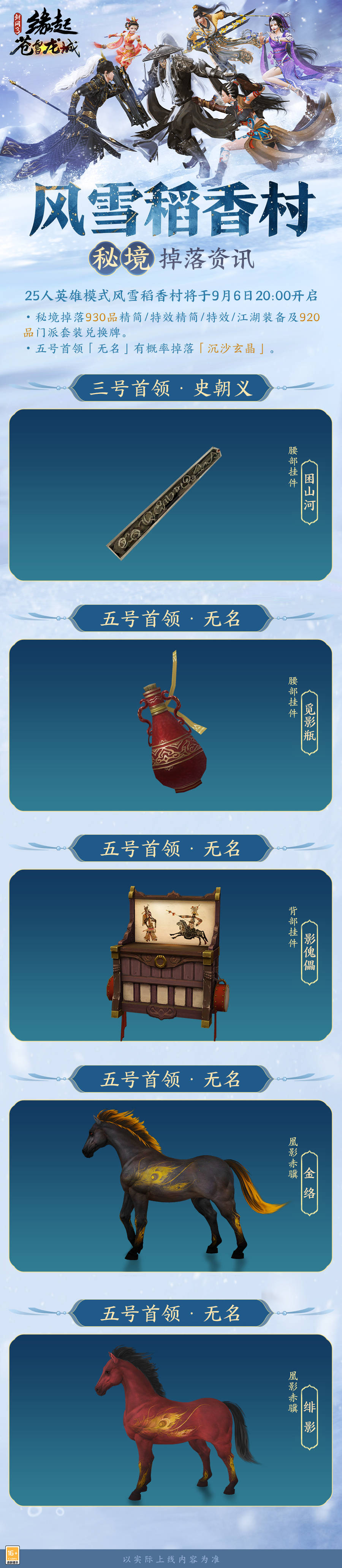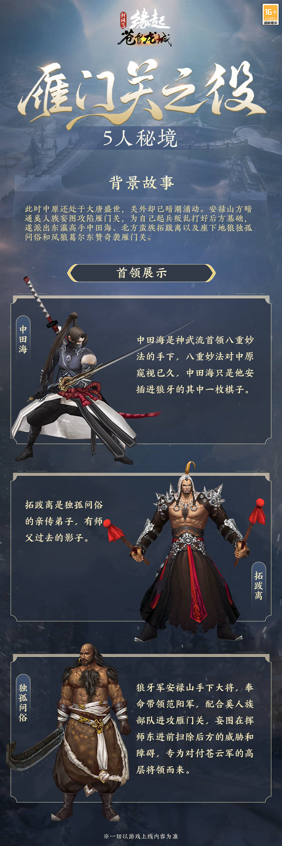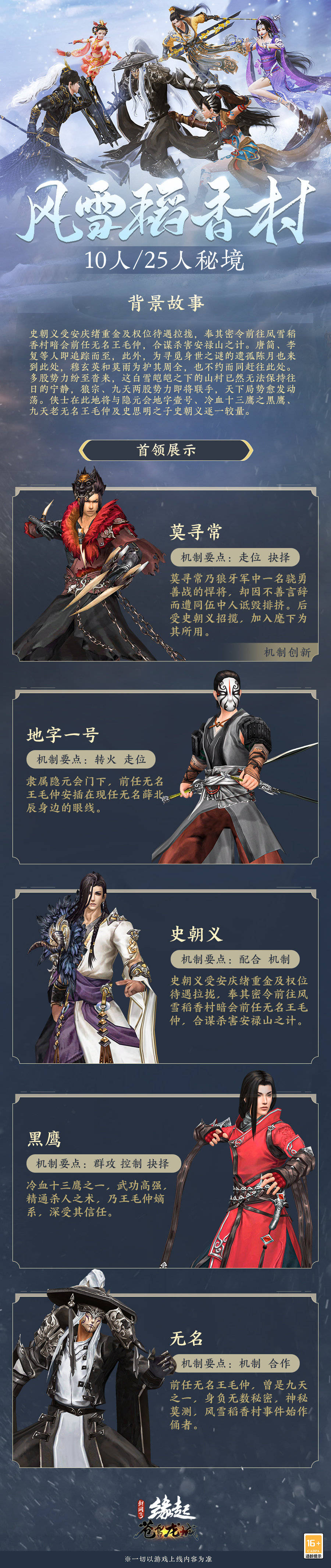 风雪骤至,掩盖了来者的足迹,本该平静的稻香村之中又暗藏着谁的阴谋?雁门关告急,安禄山方暗通奚人族妄图侵袭,粉碎安禄山的诡计,守卫边关之役还需诸位侠士一臂之力!全新秘境等待诸位侠士前往探索!据点归属、军械竞逐,横戈荡决玩法升级,是合作共赢还是针锋相对全凭侠士们定夺!