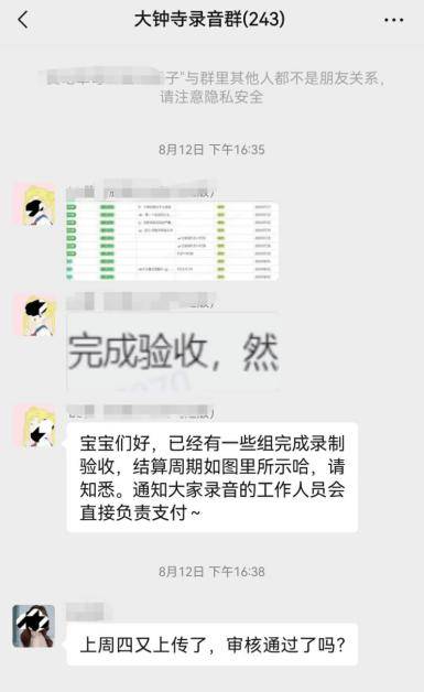 在样音二审过后,张雪在提交样音的第二周预约了晚上6~9点的录音时间。而在群聊内,不少人都被卡在了样音环节,“审核老师喜欢能聊的,爱聊的。”情绪高昂的对话,内容有主题,让更多的人卡在了筛选的第一道门槛。