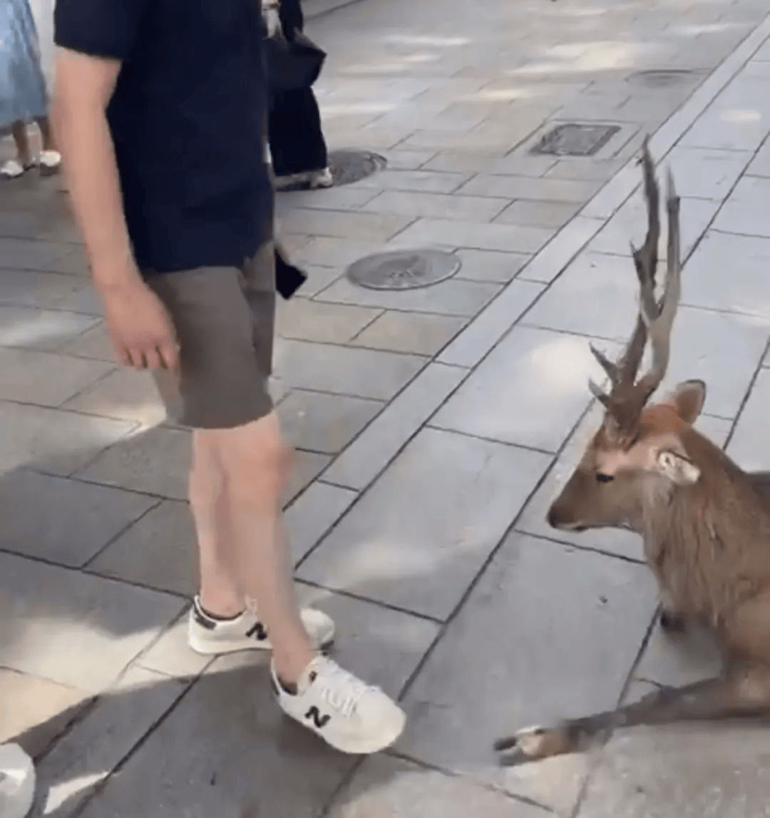 在视频中,只见一只小鹿正躺在奈良公园附近的商店街上休息,一个带墨镜的黑衣男子路过时,伸出右脚触碰到小鹿的蹄子。