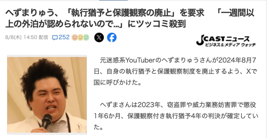 原田将大也是这种人。他在去年因“盗窃罪”和“妨碍威力业务罪”而被判处有期徒刑1年6个月,缓刑4年(带保护观察期)。