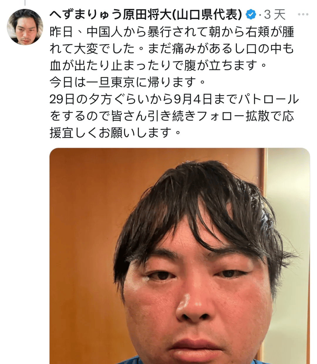 发布该视频的博主,名为“へずまりゅう”原田将大,自称是“奈良鹿的守护者”,要赶走所有欺负奈良鹿的中国游客。