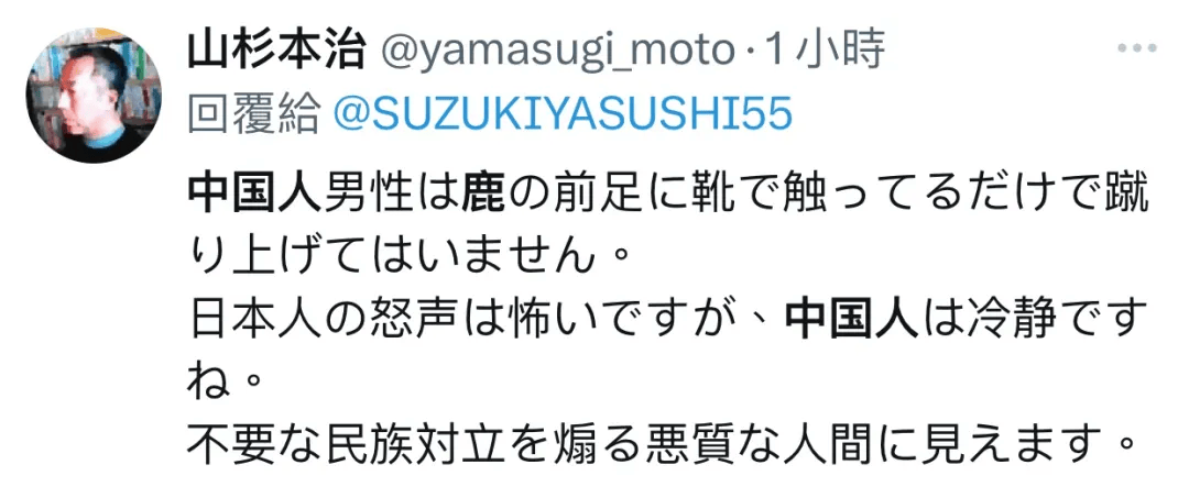 “这位中国男子只是用鞋子触碰到小鹿的蹄子,并没有踢它。日本人的愤怒让人害怕,相较之下中国人冷静多了。请大家不要再被这种恶意煽动民族情绪的人误导了。”