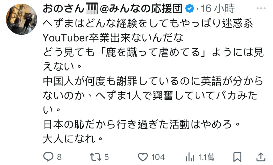 “即便有过此前的经验教训,原田还是无法舍弃油管网红这碗流量饭。这个视频怎么看都不是像你描述的那样‘踢鹿虐鹿’。这位中国男子都已经数次致歉,难道你是不懂英文吗?请成为一个真正的大人,不要再做类似的骚扰行为了,因为这将会成为日本之耻。”