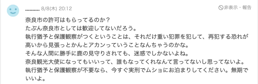 “你在奈良的所作所为,得到奈良市的许可吗?奈良市估计不会欢迎你吧。你犯了这么严重的罪行,再犯罪的可能性很高,因此缓刑和保护观察期是政府对你的监视和监督。被像你这样的人看护小鹿,只会造成麻烦吧。我不觉得谁都可以成为奈良观光大使。如果你不想要缓刑和保护观察期的话,请马上以实刑入狱,最好就是无期徒刑。”