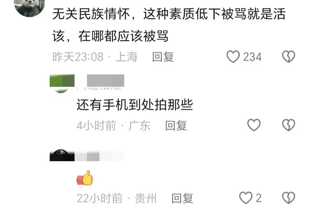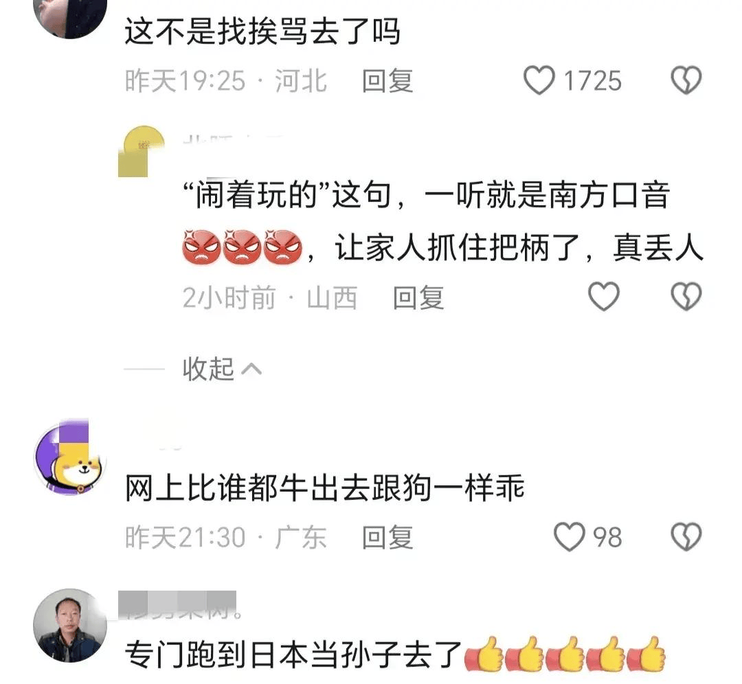 回到这事儿本身,不少日本网友看了视频之后,有的支持那位大爷,觉得中国游客做得不对;但也有人觉得大爷反应过激了,毕竟视频里看起来游客并没有恶意。