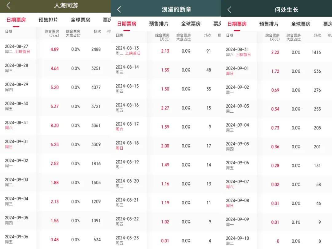 据猫眼专业版信息,《人海同游》上映首周全国平均排映总场次能达到3000场以上,最多的一天有4000余场。