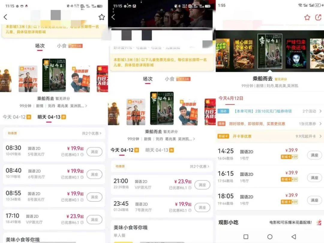 不止正在热映的《人海同游》,陈小雨向娱乐资本论提供的截图显示,今年4月,部分影城排映《乘船而去》时以满座锁场、阴间时段排片或高价VIP厅排映方式“虚假排片”。