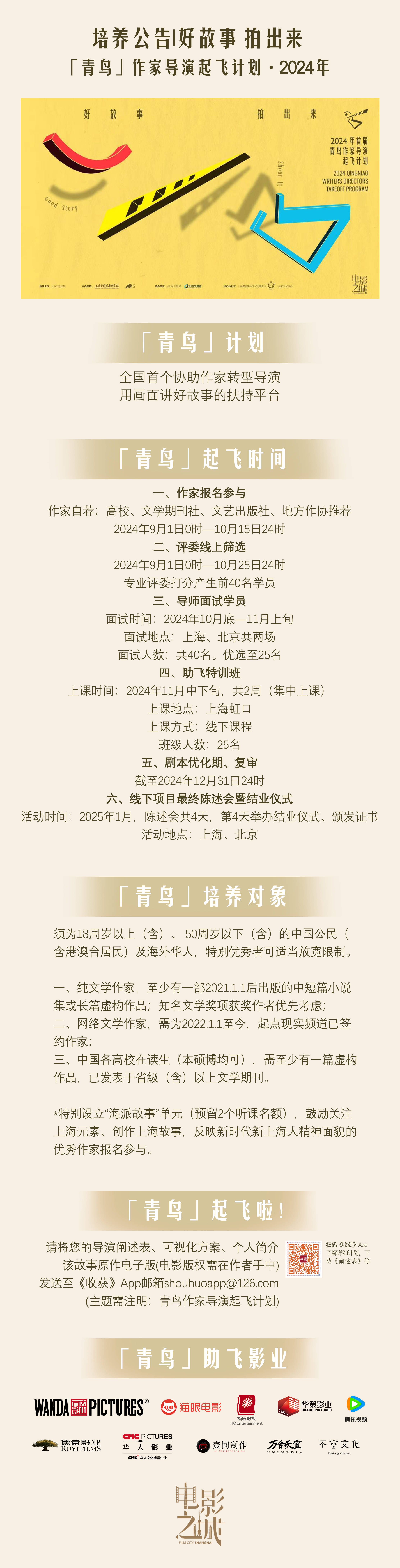 今年6月,《弘扬城市精神 打造电影之城 上海市电影高质量发展三年行动计划(2024-2026)》发布,“青鸟”作家导演起飞计划应运而生(下文简称“青鸟”)。该计划由上海市电影局指导,上海电影发展研究院、《收获》App主办,虹口区文旅局、长远文化集团协办,麋鹿将军文化有限公司和海派文化中心承办。它立足上海这座“电影之城”,是全国首个协助作家跨界转型、用画面讲好故事的扶持平台。9月开始,“青鸟”展望全国,向有志成为导演的优秀纯文学作家、网络文学作家、中国各高校在读青年学生、“海派故事”优秀作家发起征集。