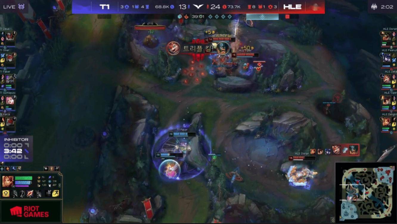 HLE打出了完美上中野前期对线节奏,双方阵容的团战表现差距更大,T1没有稳定输出点,而且只要前期劣势那基本只能被从头碾压到尾。