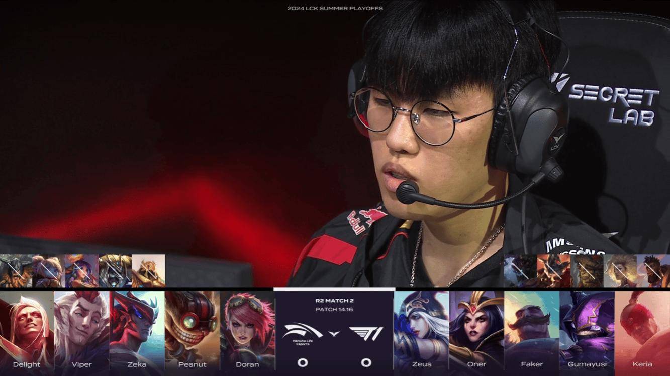 这场Bo5的第一局,HLE的BP就很大胆。永恩并没有搭配传统意义上好用的打野猪妹,而是选择了蓝色方一抢蔚。AP伤害则是由上单Doran的吸血鬼以及下路的炸弹人补足,从一开始HLE就想清楚了自己的阵容。T1红色方第一轮的选择是艾希和妖姬,中单的选择并不好。这也是因为T1现在默认Faker玩AP首选只有沙皇,否则就是其他版本热门的AD英雄或者狗头这种功能角色,妖姬属于是AP备胎了。而且早早出妖姬也是给了对手永恩的发挥空间。