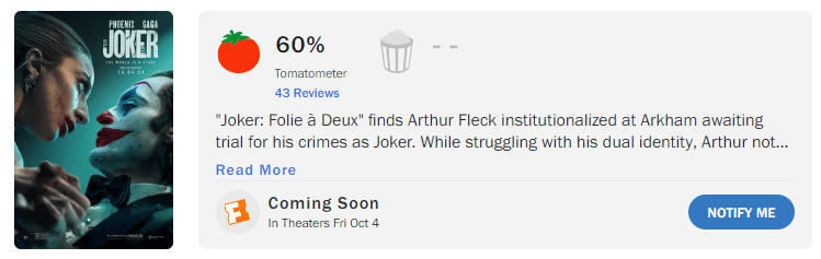 可惜在威尼斯首映后,《小丑2》遭遇了口碑滑铁卢——烂番茄新鲜度仅有60%,43个评价中有17个差评;在较为严苛的Metacritic上,仅有53分,22个评价中有11个中评、2个差评;目前IMDb上共有304个评价,评分仅有5.9分。