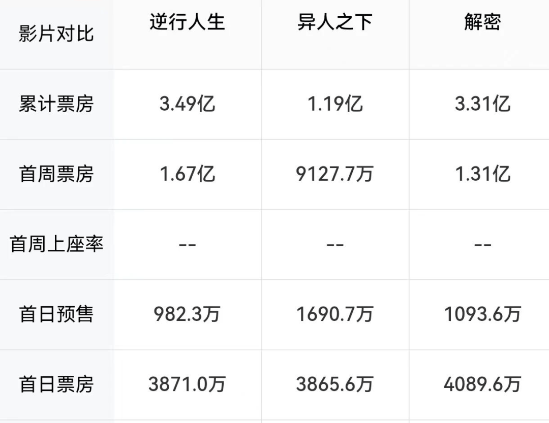 《异人之下》《解密》虽然在类型创新方面值得业内认可,但二者最终的失败来源于大众对这两部影片的“陌生”感,而《逆行人生》则与市场主流情绪违和而造成。