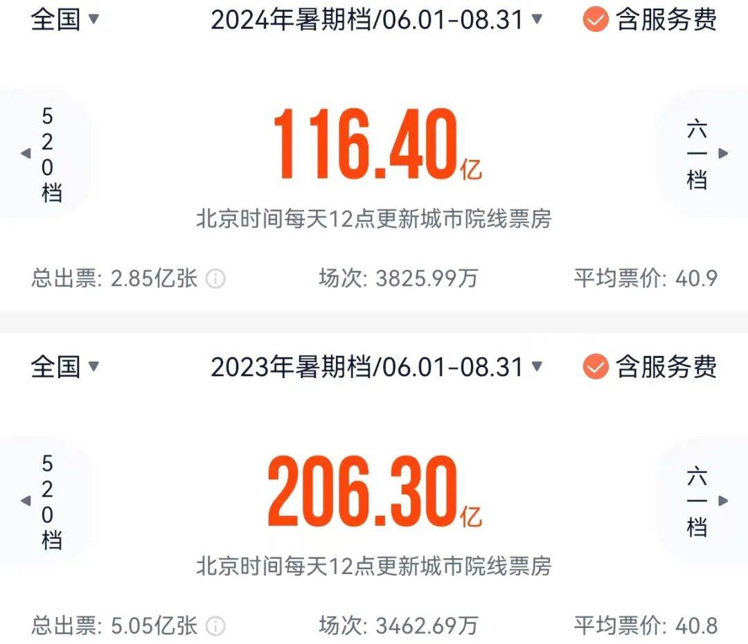 据灯塔专业版数据显示,2024年暑期档票房116.40亿元,相比去年同期的206.3亿接近腰斩,略微高于2014年的112亿、低于2015年的124.77亿,因而,电影市场回到十年前的水准在业内流传着,更多带有悲哀和无奈之情。