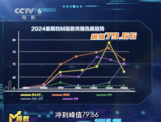影片《异人之下》在“M指数传播指数”中脱颖而出,在上映当周厚积薄发,传播指数冲到峰值79.66,创造了暑期档影片历史最高传播热度。
