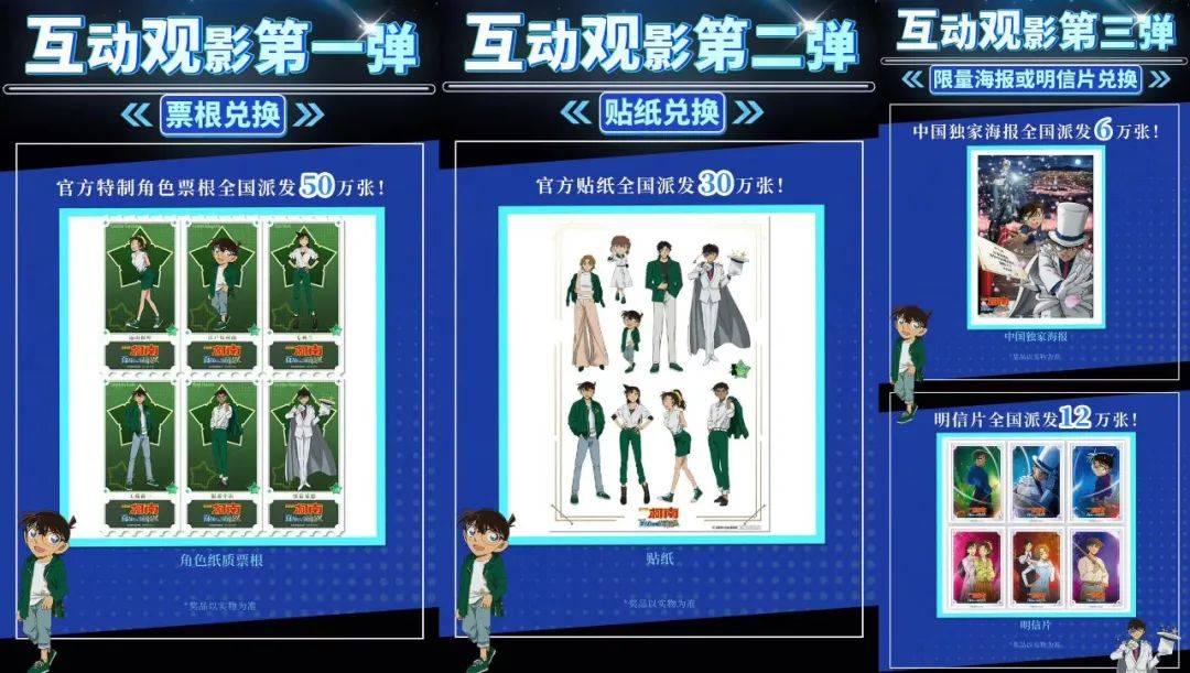 今年以来,观影特典逐渐成为日本动画电影的固定配套宣发。今年的《百万美元的五棱星》也加入这一阵营,实体票纸、贴纸、海报……从上映首周到上映第三周,丰富的实体特典分阶段覆盖至了全国11000家影城。
