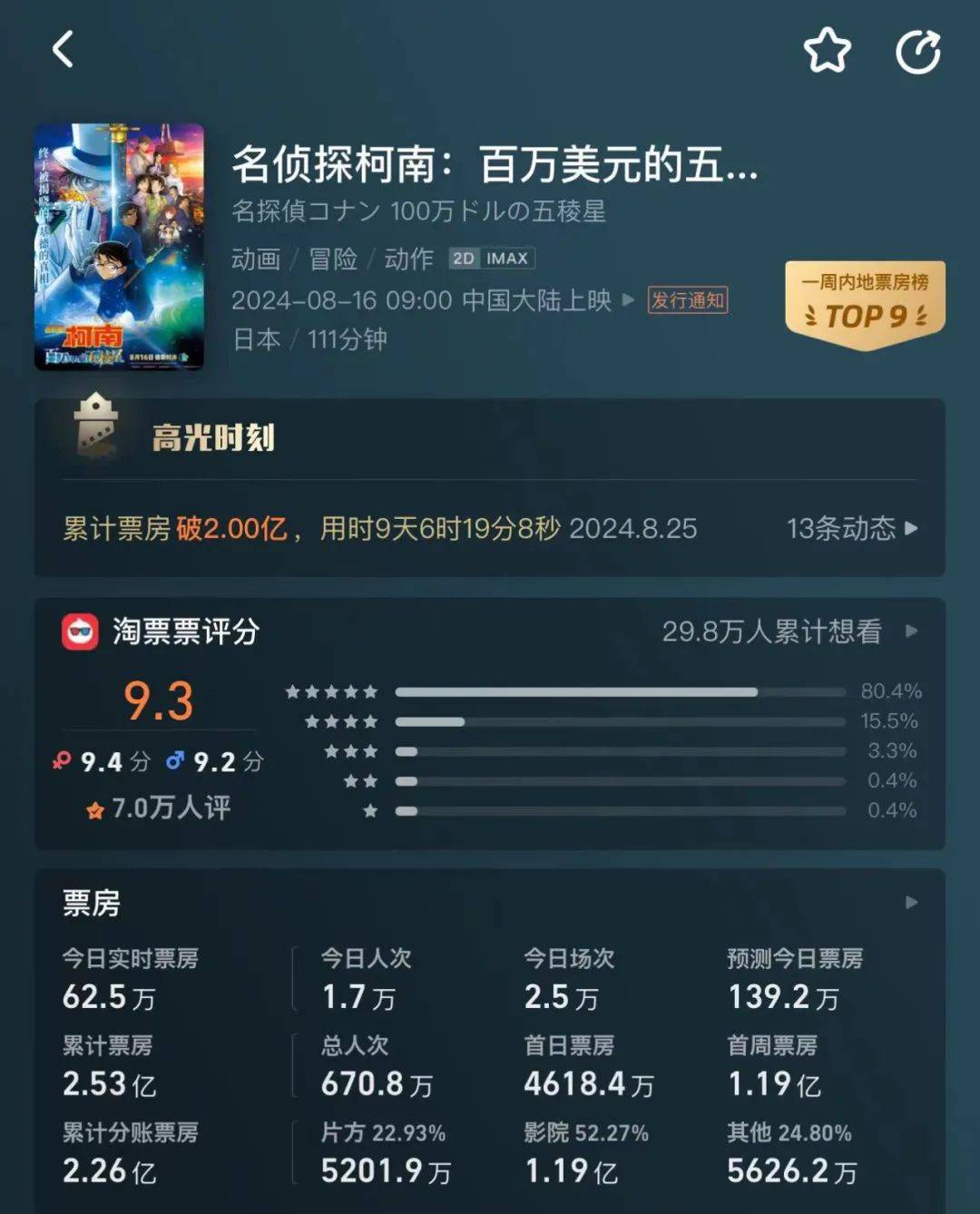 具体来看,《百万美元的五棱星》是在近五年《柯南》剧场版中口碑居上游的一作,这有利于影片在市场走得更远。