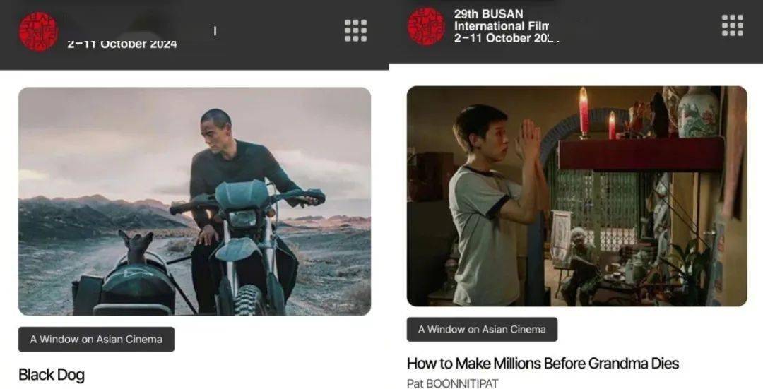 此外,由管虎执导,彭于晏、佟丽娅领衔主演的《狗阵》、马群耀主演的《姥姥的外孙》将于第29届釜山国际电影节“亚洲电影之窗”单元展映。本届影展将于10月2日-10月11日在韩国釜山举行。