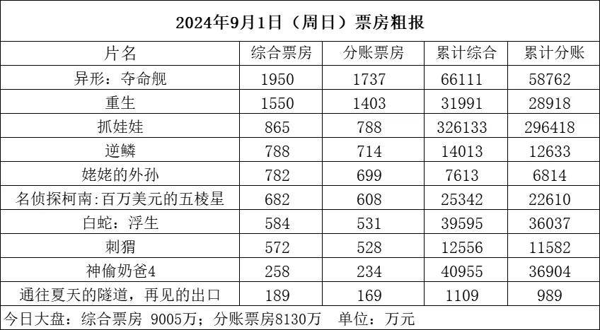 9月1日(周日),全国共排映43.2万场,观影人次约168.5万,根据初步统计产出票房9005万。