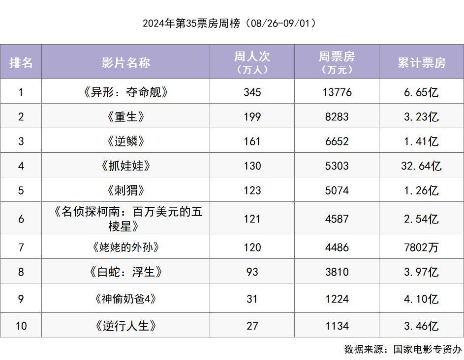 上周(2024/8/26-9/1)共收获票房5.94亿,《异形:夺命舰》《重生》《逆鳞》位居周票房榜前三。上周是暑期档尾声,观众观影热情减退,较前几周,市场大盘有所回缩。截至8月31日,2024暑期档最终以116.38亿票房收官。