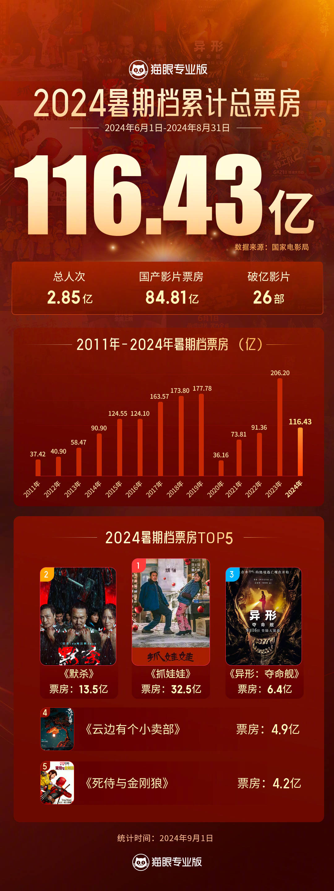 搜狐娱乐讯 据猫眼专业版数据,2024年暑期档(6月1日至8月31日)总票房116.43亿元,观影人次为2.85亿。对比去年206.2亿近乎腰斩。国产影片票房为84.81亿元,占比为72.84%,两部好莱坞R级片进入前五。