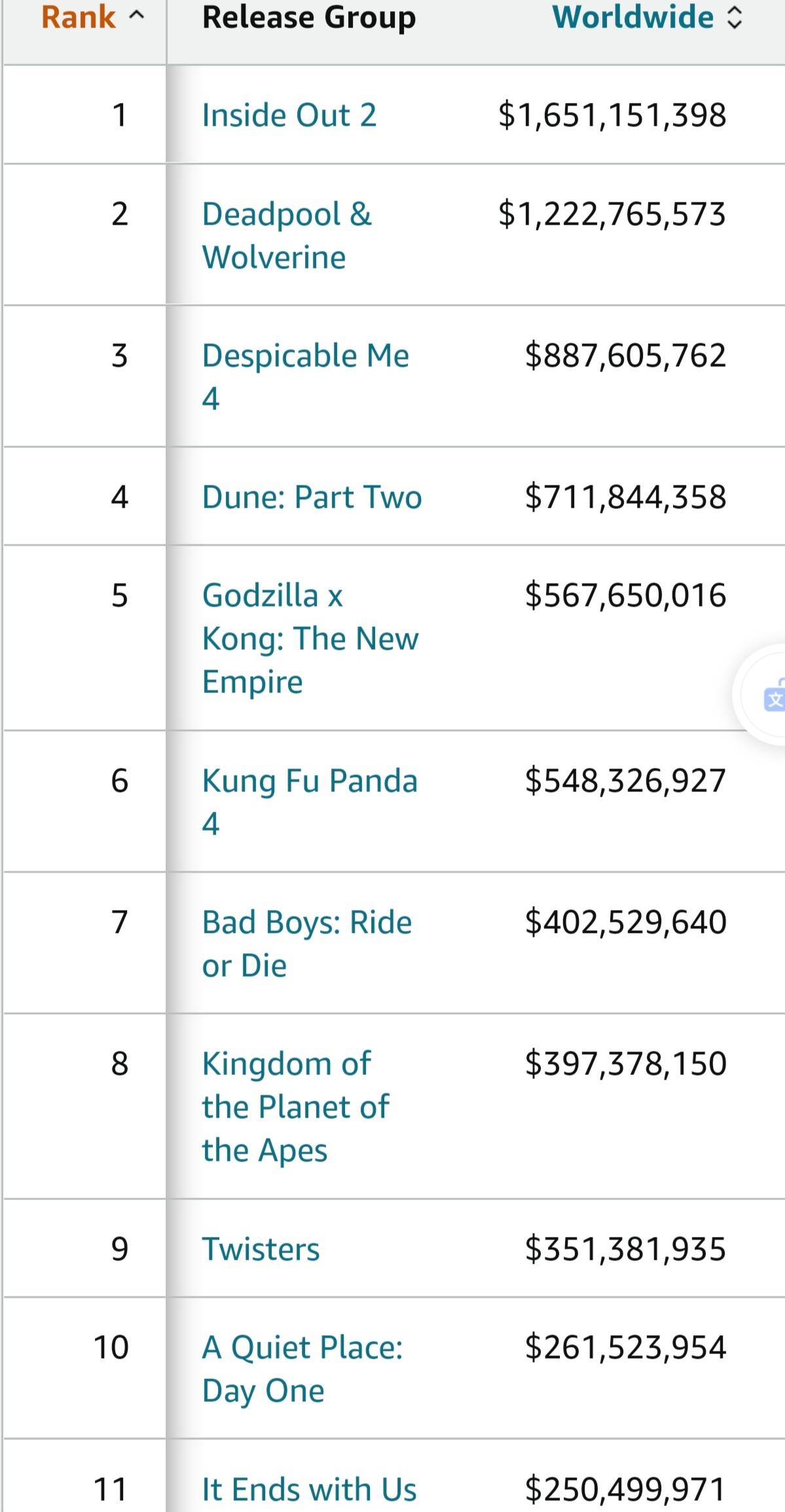 2024年好莱坞暑期档电影包揽了年度票房榜前三。动画片《头脑特工队2》制作成本2亿美元,全球票房16.51亿美元。《死侍与金刚狼》制作成本2亿美元,宣发成本1亿美元,全球票房12.23亿美元。《神偷奶爸4》制作成本1亿美元,全球票房8.88亿美元,都是爆赚。
