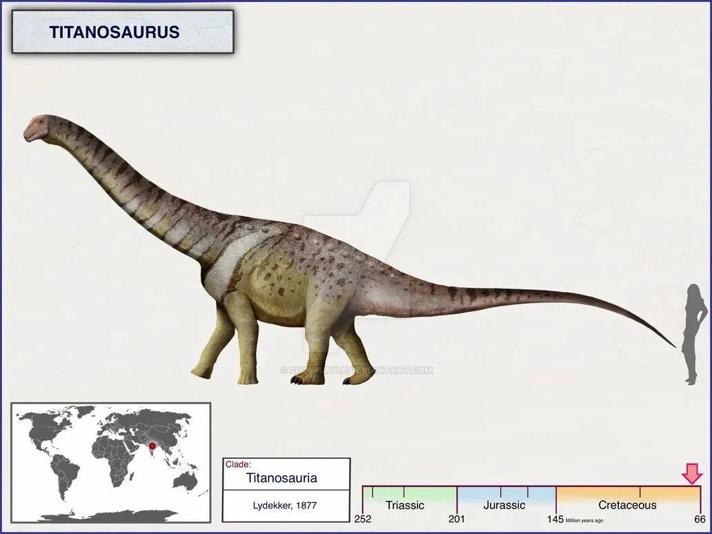 在真正的蜥脚类泰坦比如《侏罗纪世界3》登场的体长26米,重65吨的施氏无畏龙面前,实在只是个弟弟,而且它还是个疑名,具体分类定位混乱而不明确。所以这里可能指的是“泰坦巨龙类”(Titanosauria)的某一种,而非“泰坦龙属”(Titanosaurus)成员。