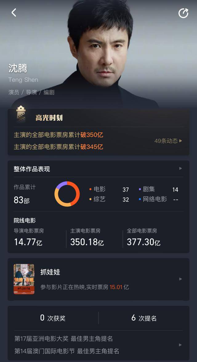 此前,7月21日,《抓娃娃》上映6天,累计票房破15亿,助力沈腾主演电影票房突破350亿。这一数据,使得沈腾成为中国影史首位票房突破350亿主演。