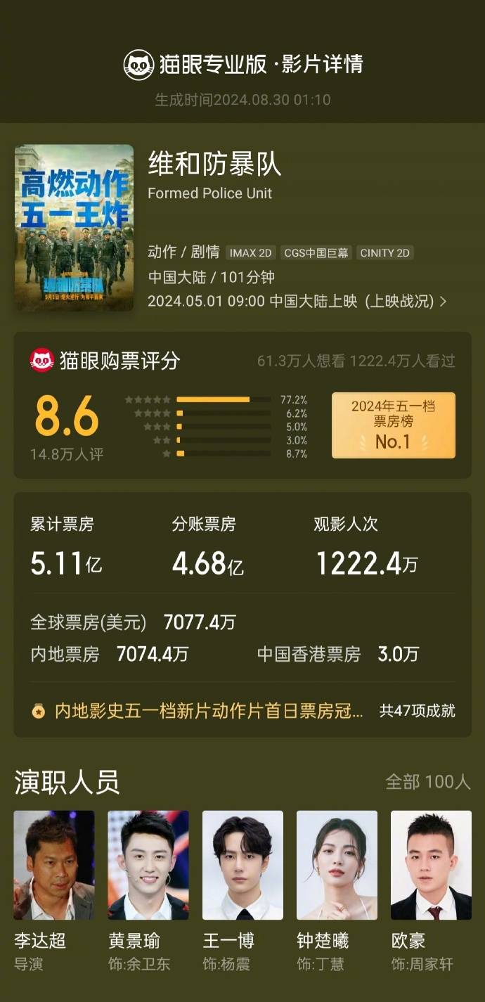搜狐娱乐讯 8月30日,据猫眼专业版数据,由黄景瑜、王一博和钟楚曦领衔主演电影《维和防暴队》8月30日结束公映,累计总票房5.11亿,总观影人次1222.4万,获得2024年五一档票房冠军。