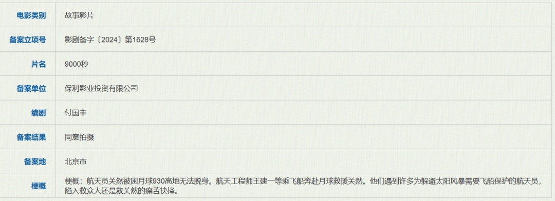 7月上半月,两部科幻喜剧立项,央视也预告出品首部太空实拍纪录片;下半月,作为《流浪地球2》(2024年9月15日重映)和《熊出没·逆转时空》的联合出品方之一,保利影业同样备案了航天科幻题材影片《9000秒》,讲述惊心动魄的外太空营救行动。